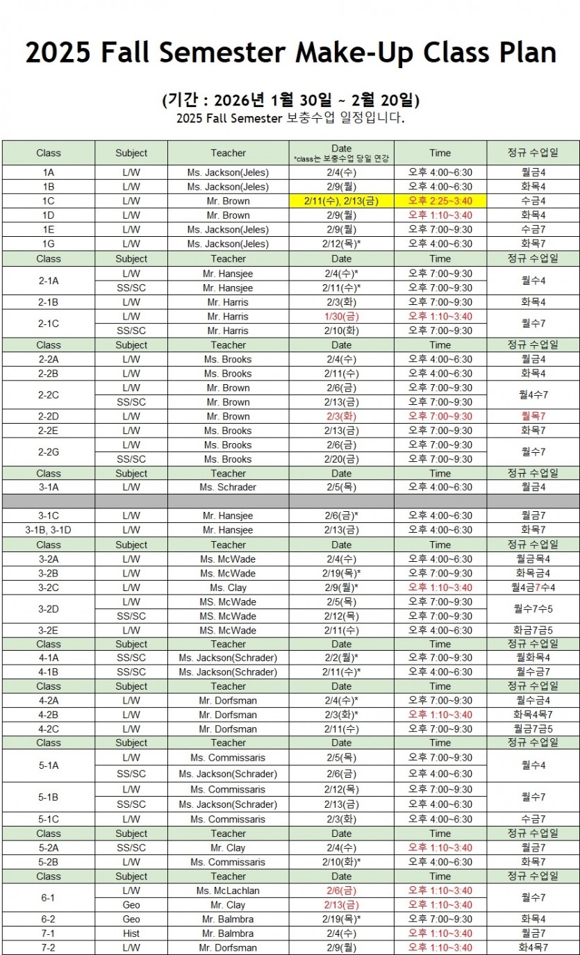 2025 Fall Semester 보충수업 일정(2026/1/30~2/20)을 안내해드리니, 모두 참석할 수 있도록 안내 부탁 드립니다.